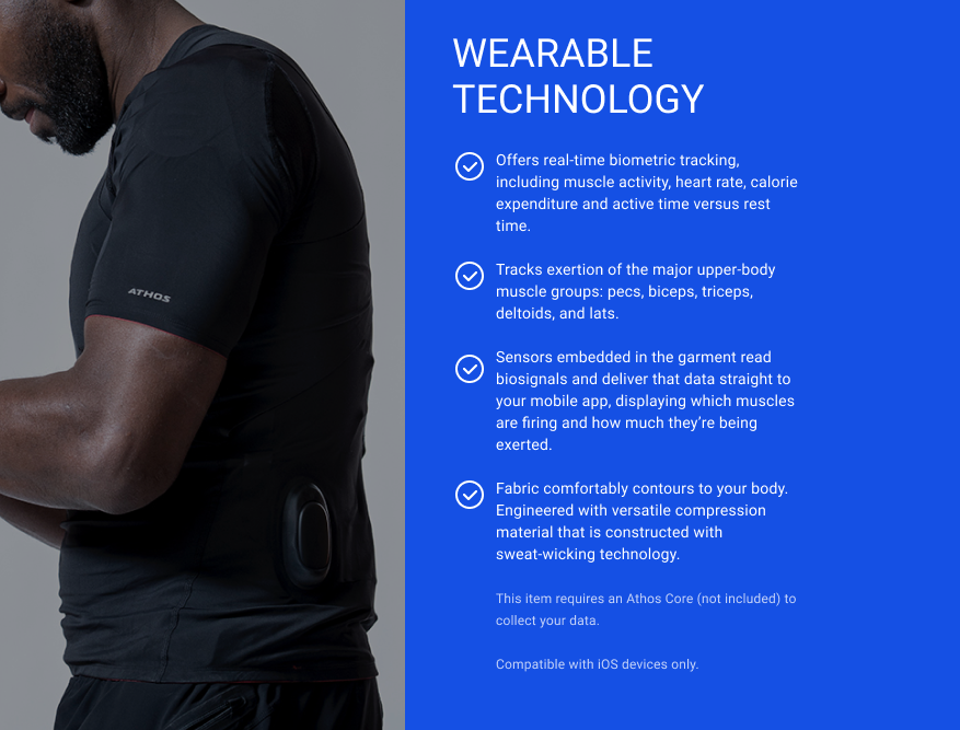 The Athos brand was centered around fitness. Athos developed the worlds first training garment with integrated electromyography (EMG) senors to measure muscle activity and used it to optimize training performance.